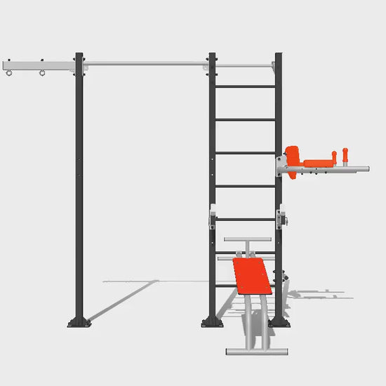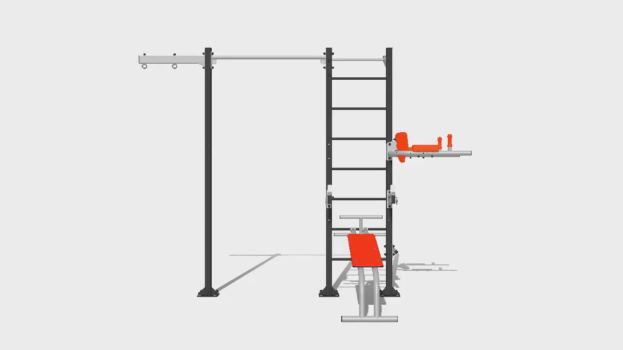 Complexul sportiv este compus din: spalier gimnastic, banca pentru dezvoltarea muschilor abdominali si pectorali, suport pentru haltera, bare paralele, suport pentru sac de box. Structura este din metal vopsit in camp electrostatic, scaun realizat din HDPE, suporturi pentru brate si spate realizate din LLDPE, manere din cauciuc. Elemente de conectare sunt din metal galvanizat si detin capace special antivandal.