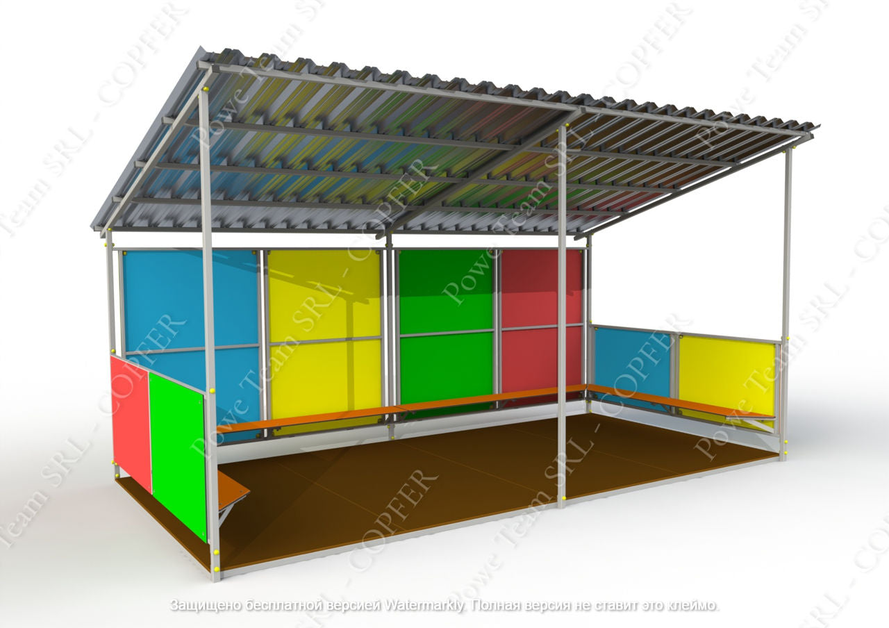 Constructia va fi constituita din carcasa metalica, 6 piloni, protectii laterale din HDPE, acoperis din tigla metalica, podea, scaun.