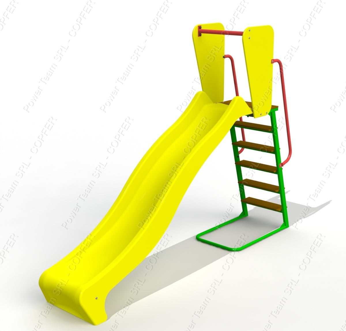 Материалы: Обработанная и покрашенная влагостойкая фанера, покрашенные порошковой краской металлические трубы, пластиковая горка и пластиковые заглушки на все болтовые соединения. (Бетонируется в землю)