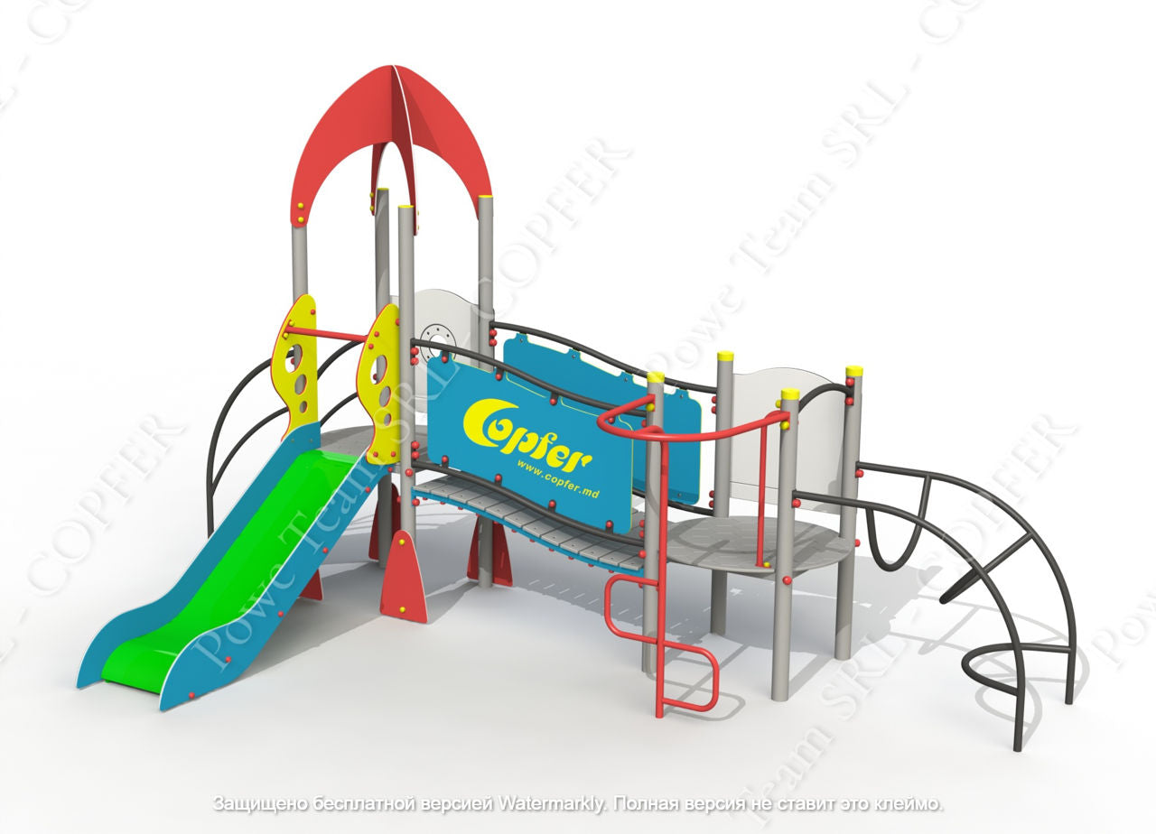 Игровой комплекс в составе башни без крыши, башни с крышей, горки ПНД (В=800 мм), лестницы, металлических альпинистов типа «Лиана», альпинистов типа «Лестница пожарного», панели HDPE «Часы», панели «Хублу», пешеходного мостика с Закрытые балюстрады типа «Вал», декоративные элементы.