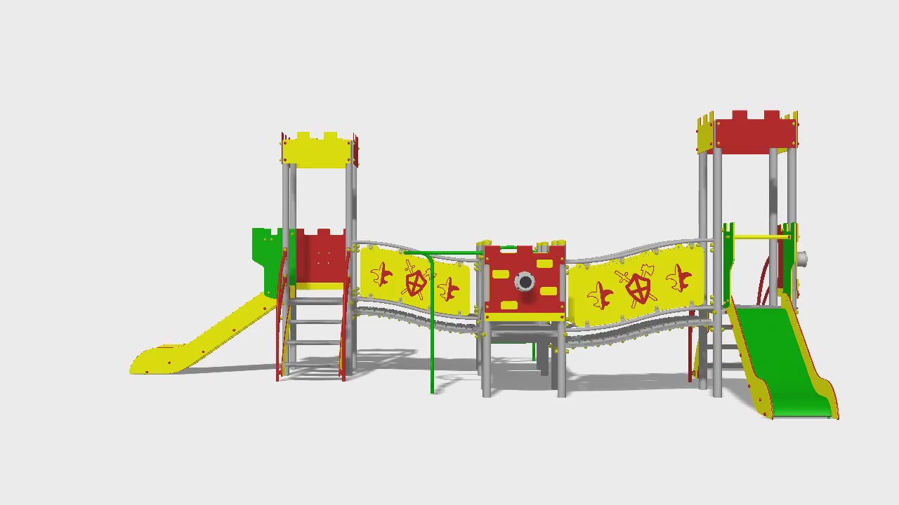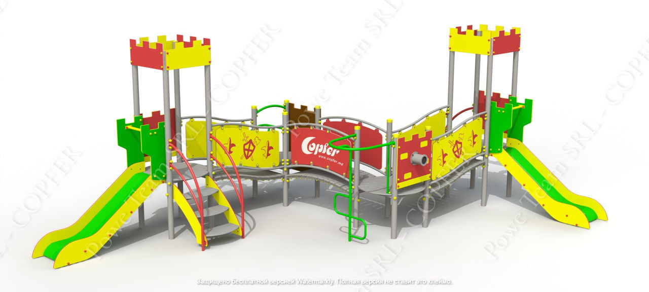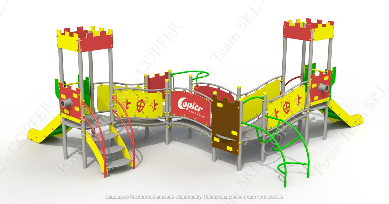 Состав: Конструкция будет состоять из 2-х башен, 2-х башен с крышей, 2-х мостов с перилами типа «волна», моста с простыми перилами, 2-х горок HDPE, 2-х лестниц, металлических подъемников типа «лиана», металлических подъемников «пожарной лестницы». типа «, перила с вращающимся диском, балконные перила, панель «доска для рисования мелом», оконная панель.