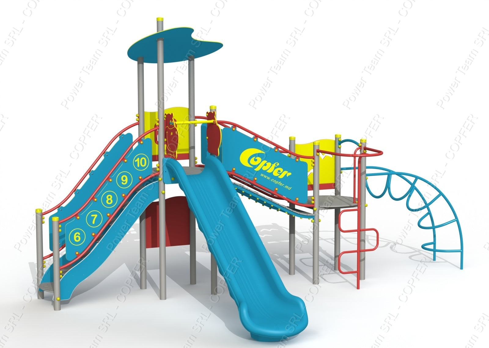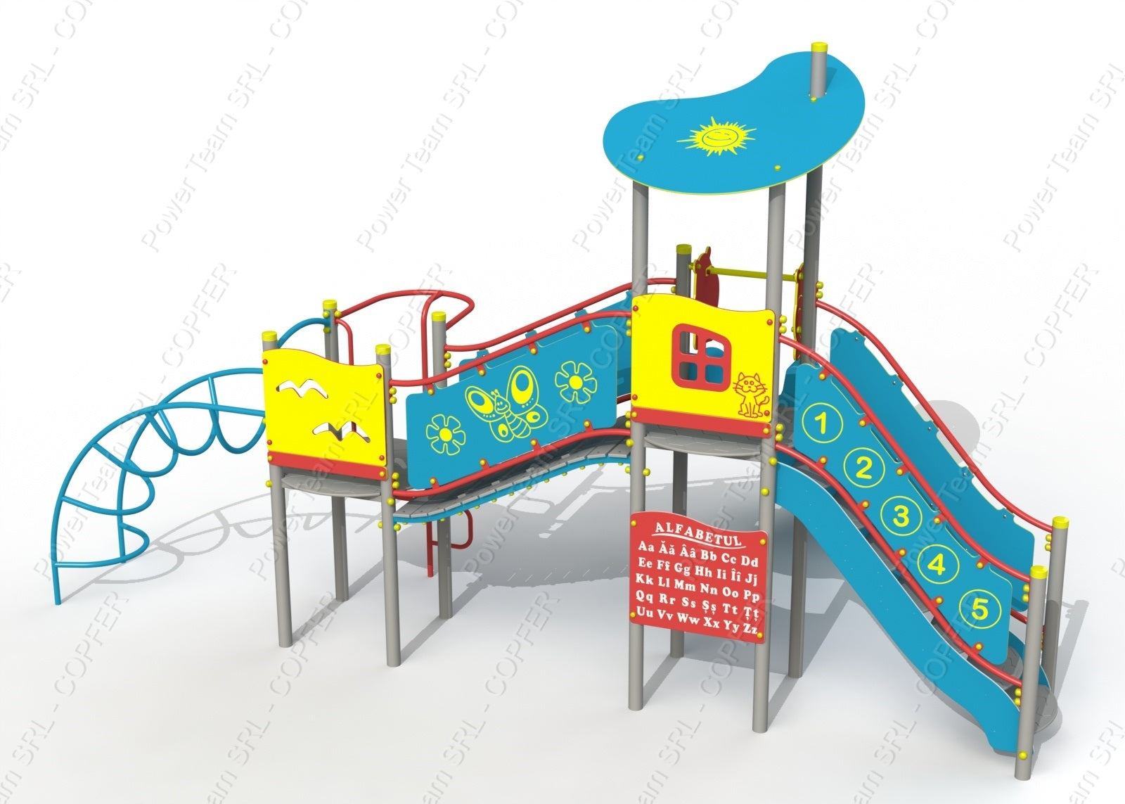 Игровой комплекс должен состоять из простой башни, башни с крышей, прямой горки, лестницы с балюстрадами с декоративными элементами, металлических подъемников типа «лиана», моста с балюстрадами типа «волна» с декоративными элементами, металлических подъемников. "Пожарная лестница", панно "Азбука".