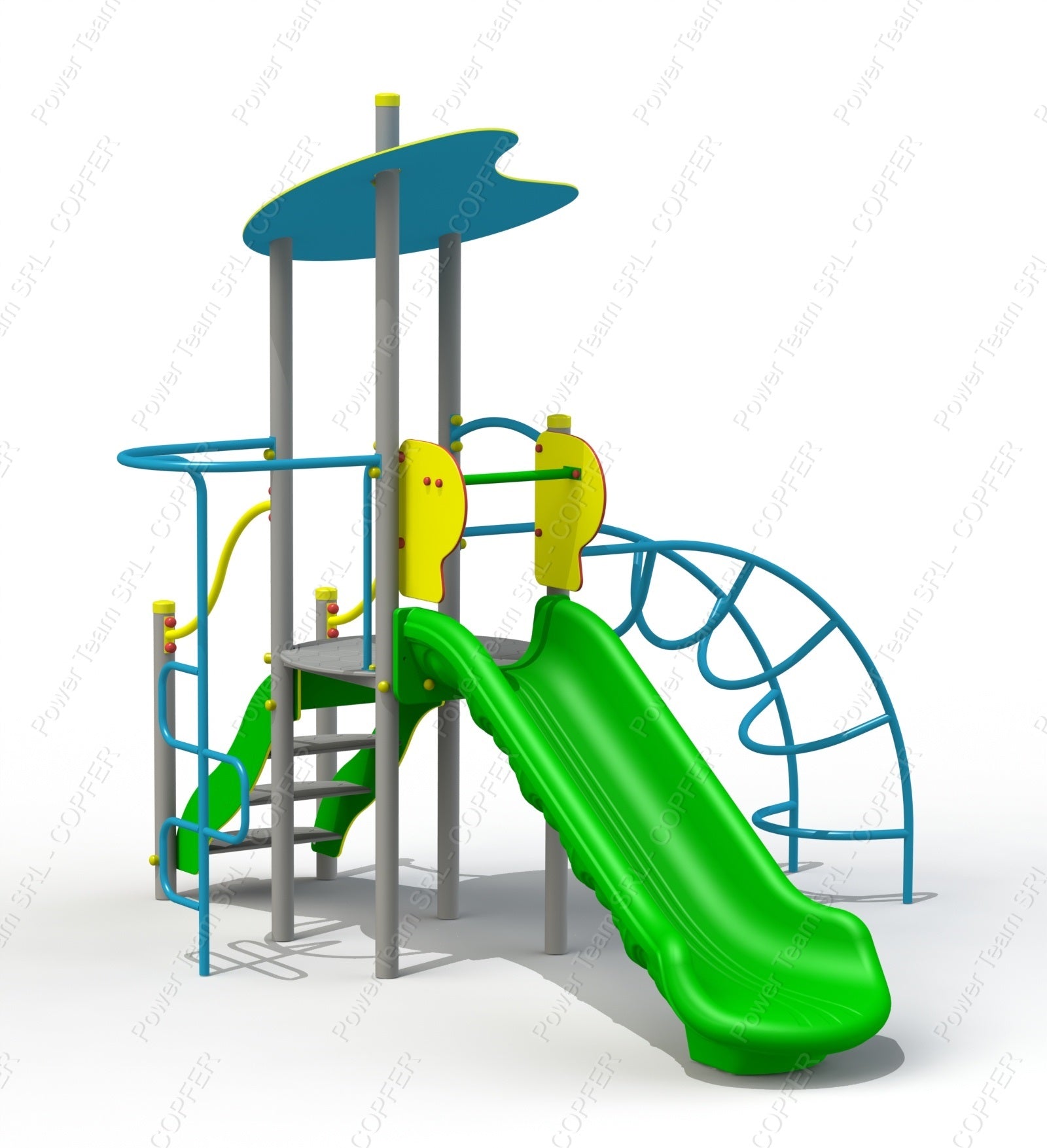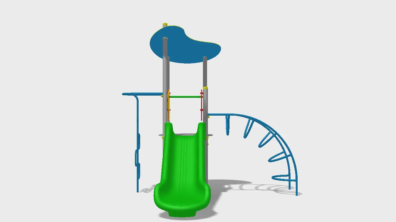 Игровой комплекс состоит из башни с крышей, прямой горки (H=1 м), лестницы, металлического лазательного элемента типа «Лиана» и лазательного элемента типа «Пожарная лестница».