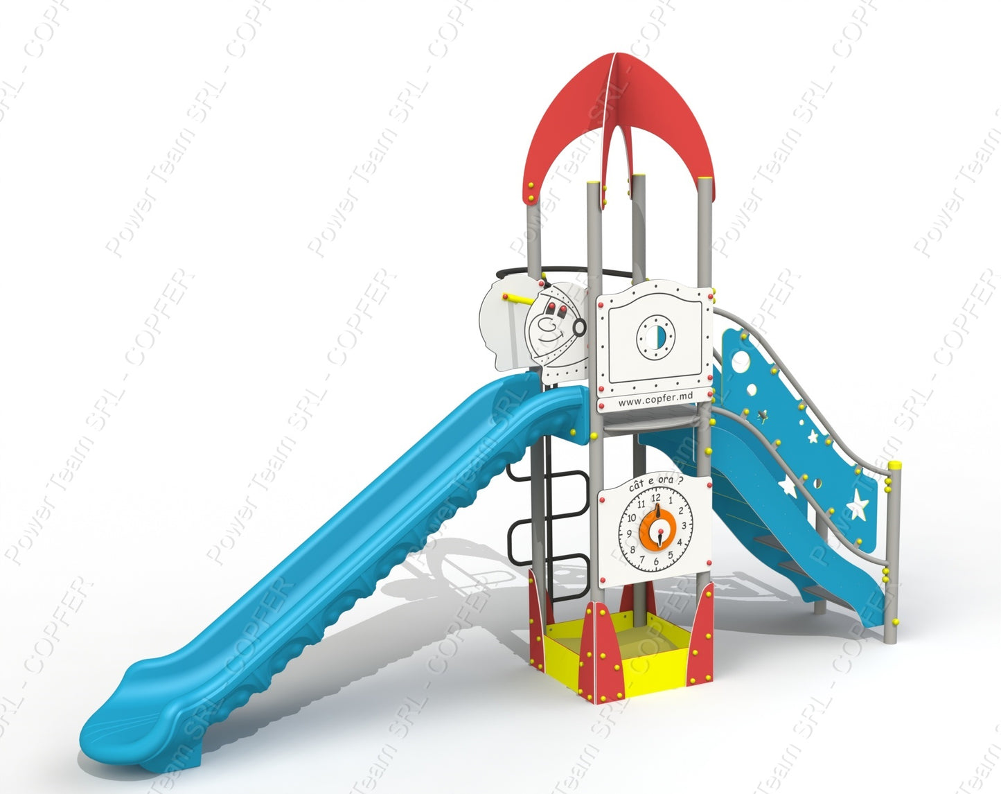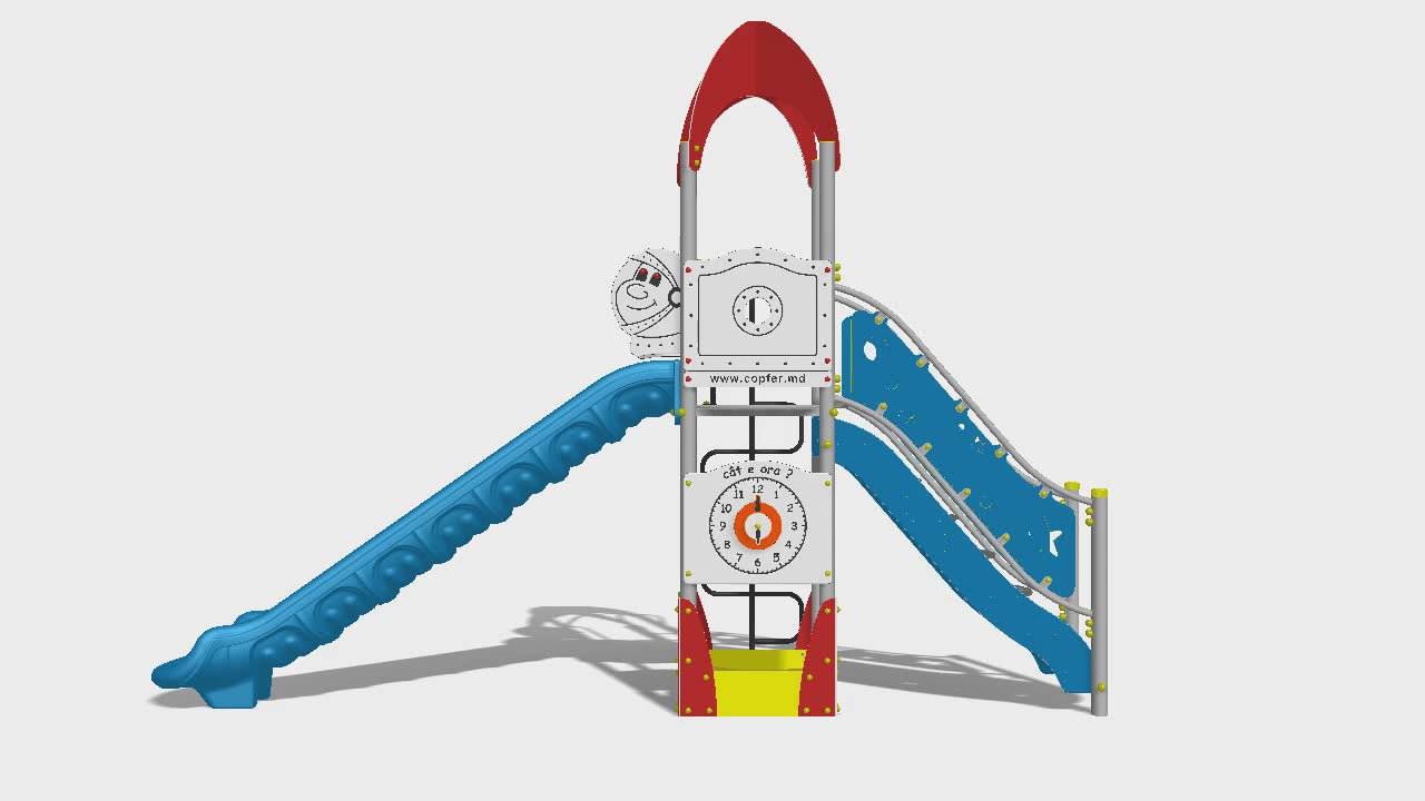 Игровой комплекс должен состоять из башни с крышей, прямой горки, лестницы, балконных перил, металлических подъемников типа «пожарная лестница», панели «Hublou», песочницы, панели «Часы».