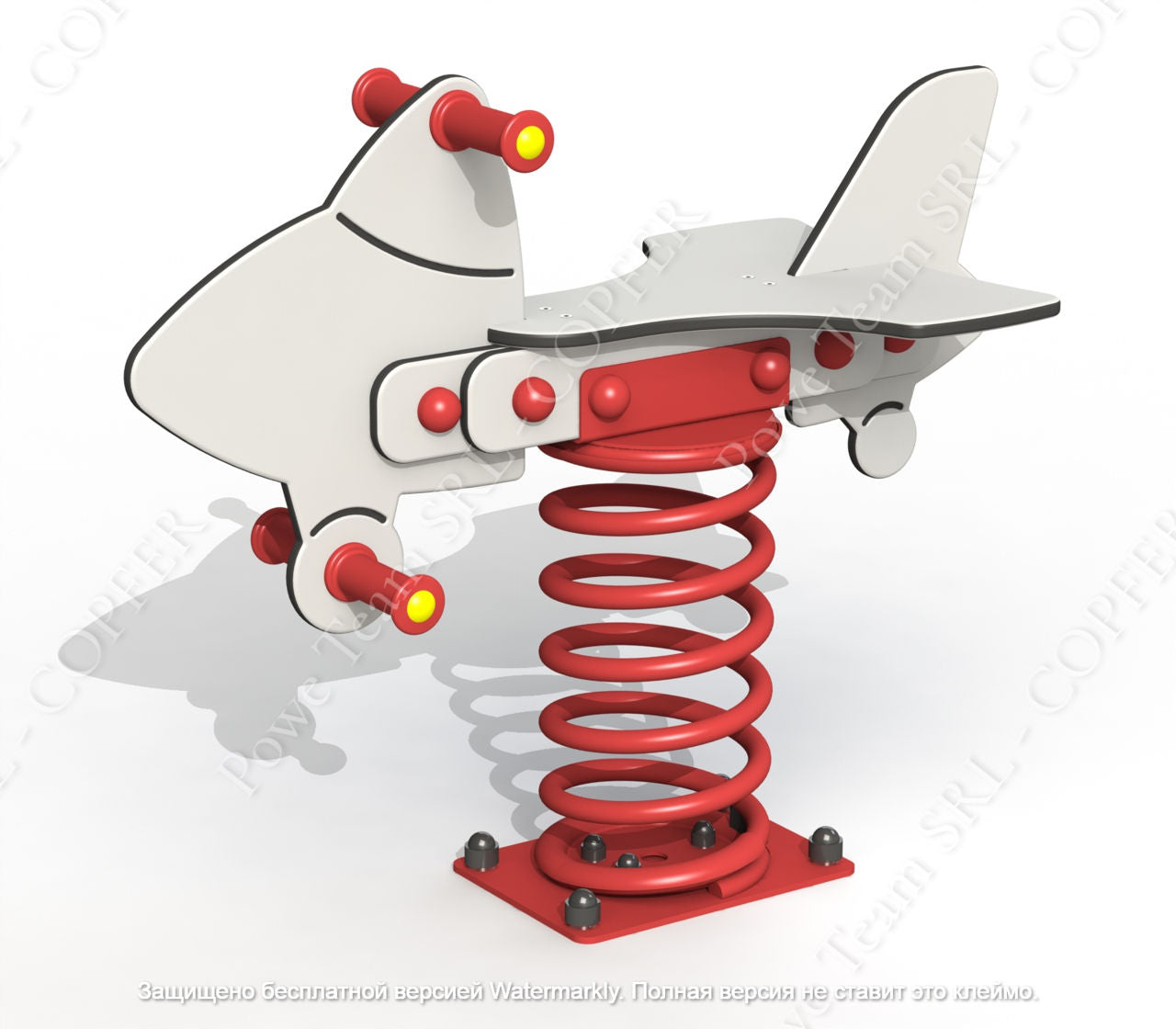 Конструкция должна состоять из нижнего основания, винтовой пружины, качалки в форме самолет, сиденья, поручней, подножек: