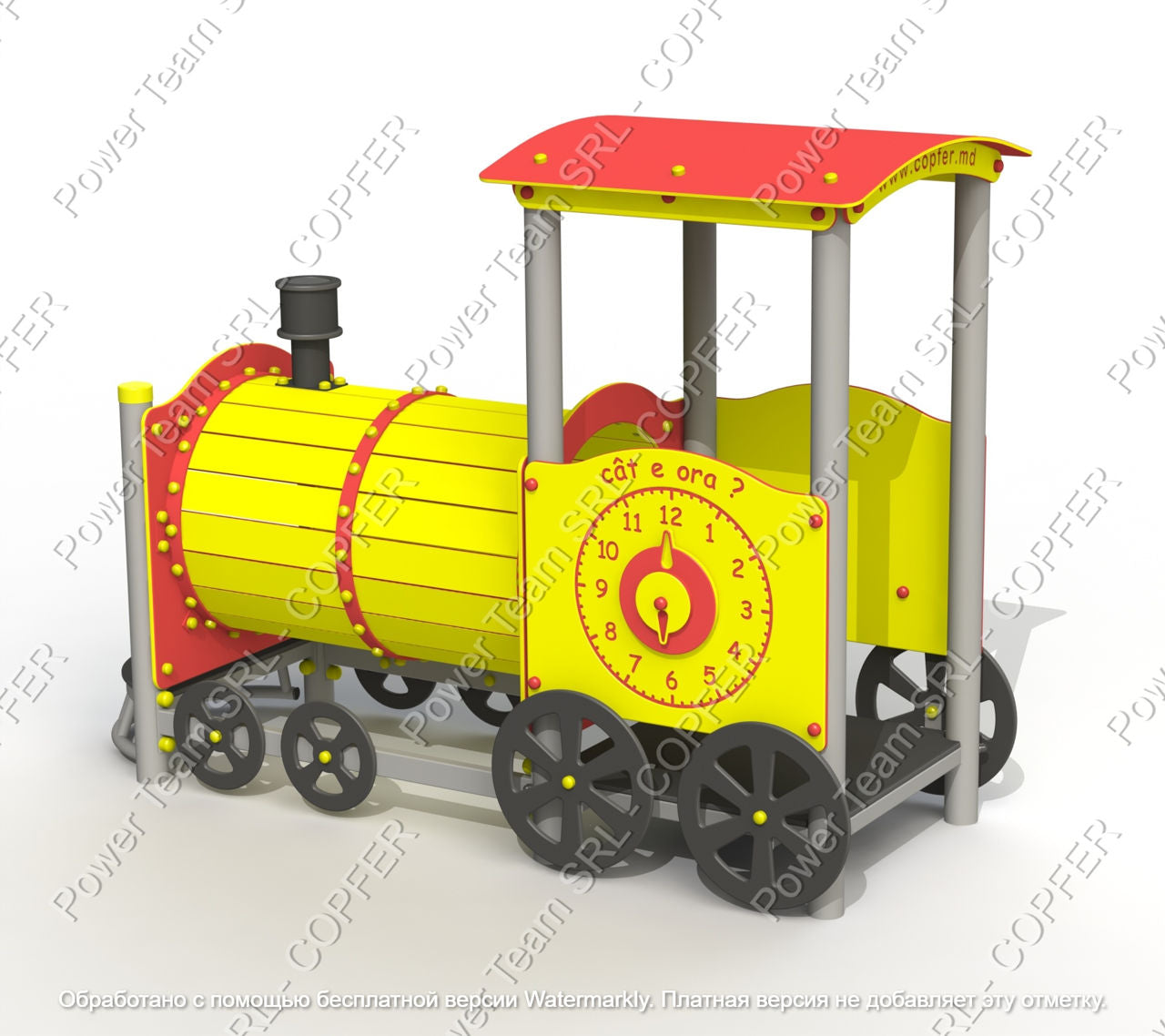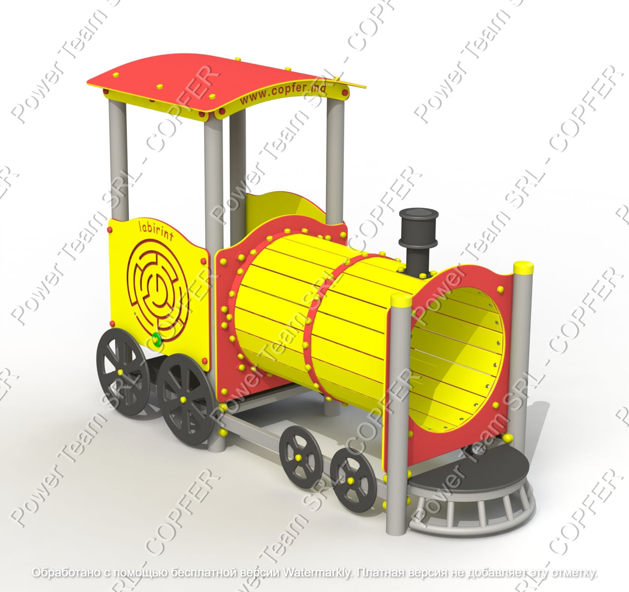 Конструкция будет состоять из опорных столбов из стальной трубы диаметром не менее 76 мм, минимальной толщиной – 3 мм. Пол должен быть изготовлен из HDPE – полиэтилена высокой плотности без токсичных компонентов с многослойной структурой различных цветов толщиной не менее 15 мм. Кровля должна быть изготовлена из HDPE – полиэтилена высокой плотности без токсичных компонентов с многослойной структурой различных цветов, толщиной не менее 10 мм. Боковые стенки необходимо изготовить из HDPE – полиэтилена высокой плотности без токсичных компонентов с многослойной структурой различных цветов, толщиной не менее 15 мм. Дульная часть поезда должна иметь форму трубки и быть изготовлена из HDPE толщиной не менее 10 мм. Колеса поезда (по 4 шт с каждой стороны) должны быть изготовлены из HDPE толщиной не менее 10 мм.