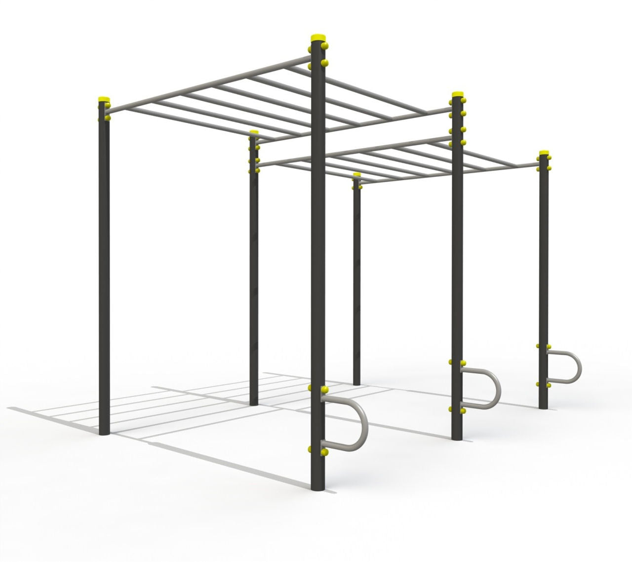 Конструкция должна состоять из 6 опорных столбов диаметром не менее 76 мм, минимальной толщиной – 2 мм. Турники для лазания будут изготовлены из трубы минимальным диаметром 33 мм и минимальной толщиной 2 мм.