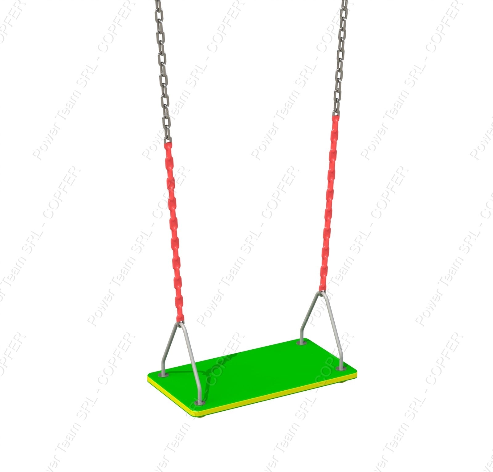 Конструкция должна быть выполнена из стального корпуса, сиденье из HDPE - полиэтилена высокой плотности без токсичных компонентов с многослойной структурой различных цветов, толщиной не менее 15 мм, цепь оцинкованная, петли с подшипниками закрытого типа.