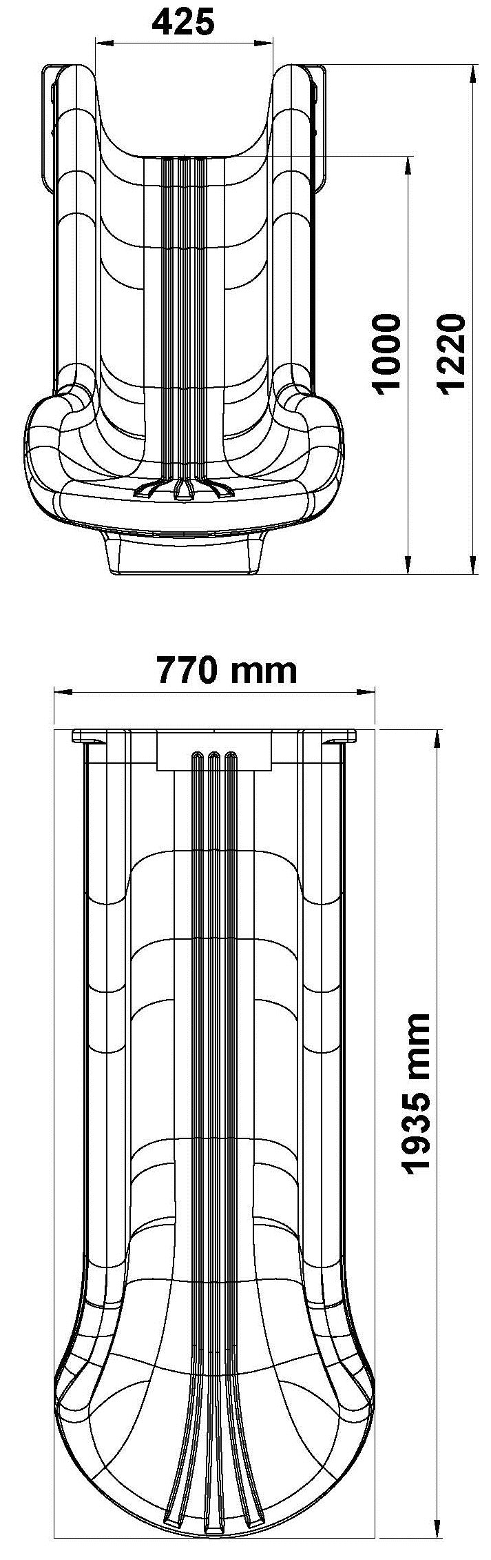 Материалы:  произведена из LLDPE (переработанные пластиковые гранулы) по технологии роторного литья, устанавливается на платформу высотой 1000 мм, предназначена для массового использования
