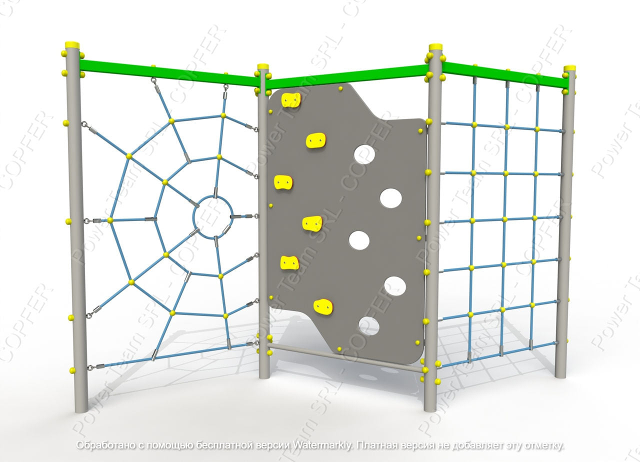 Конструкция будет состоять из 4-х несущих металлических опор, 2-х сеток для лазанья, стены для скалолазания.