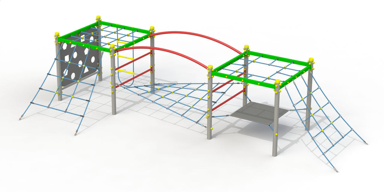 Компоненты: Конструкция будет состоять из металлических труб, окрашенных порошковой краской, армированных веревочных лестниц, батута, скалодрома из HDPE – многослойного полиэтилена высокой плотности.
