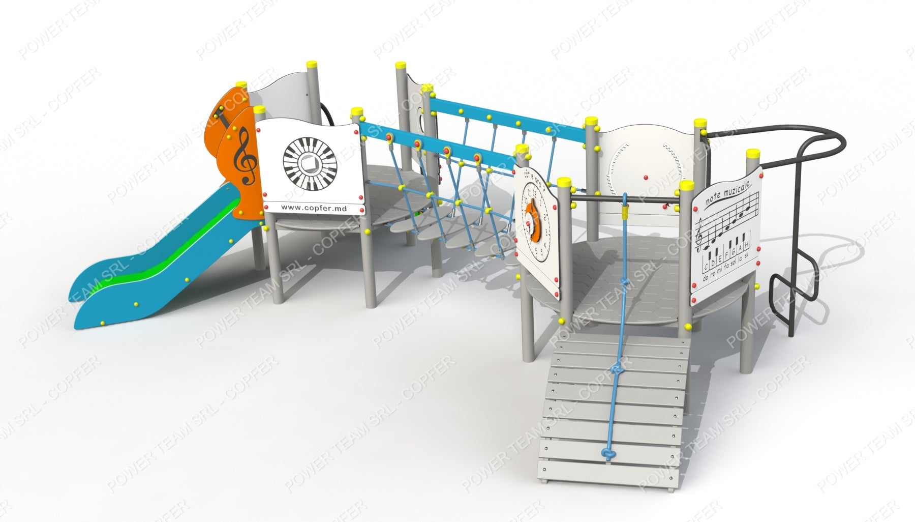 Игровой комплекс будет состоять из 2 шестиугольных башен, прямой горки (H=0,6 м) с защитными поручнями и боковыми ограждениями, 2 панелей «Пианино», доски «Который час?» панель «Кто быстрее?» панель, интерактивная панель «Ксилофон», скалодромы типа «Пожарная лестница», веревочный мост, веревочный мост для лазания, лестница.