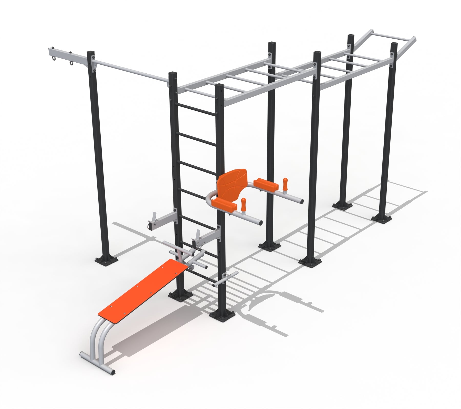 Спортивный комплекс будет состоять из: гимнастической стенки, скамьи для развития мышц живота и груди, 2 перекладин разного уровня для лазания руками, горизонтальных перекладин, подставки для штанги, параллельных брусьев, подставки для боксерского мешка.