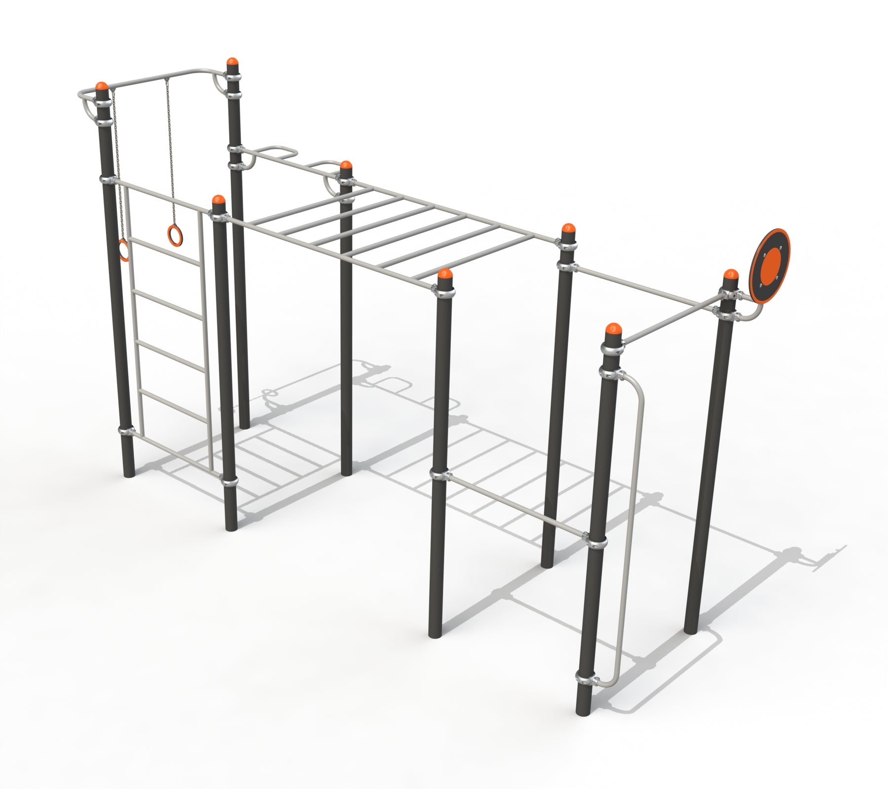 В состав комплекса входят: комплект турников разного уровня, шведская лестница, турник с гимнастическими кольцами, брусья для лазанья, брусья для лазанья зигзагообразной формы, мишень.