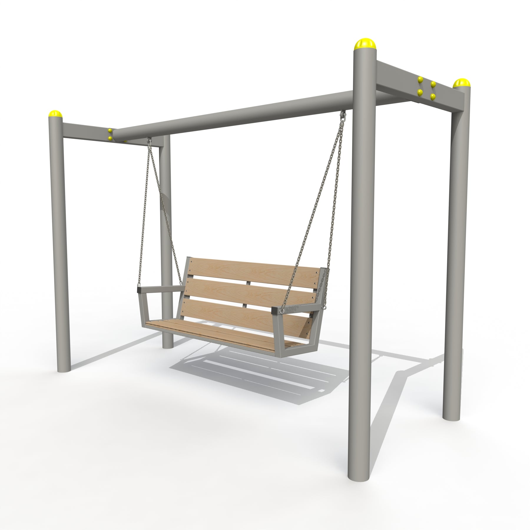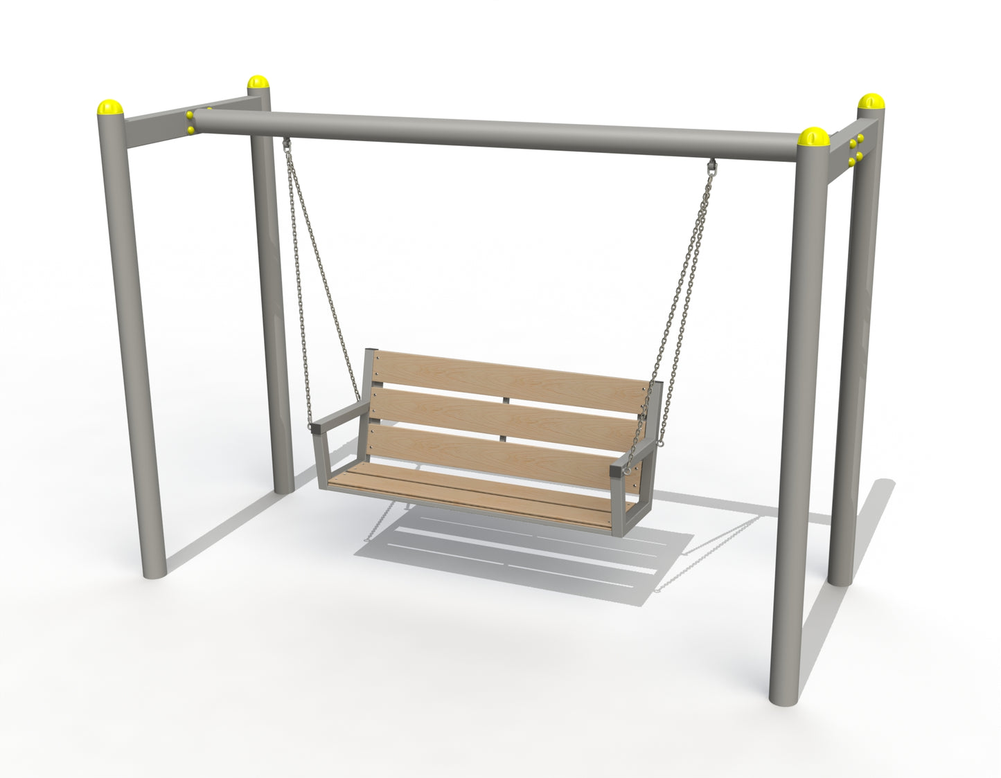 Качель должна состоять из 2 комплектов несущих металлических опор, горизонтальной металлической балки с фиксирующими устройствами для 1 скамьи длиной 1,5 м.